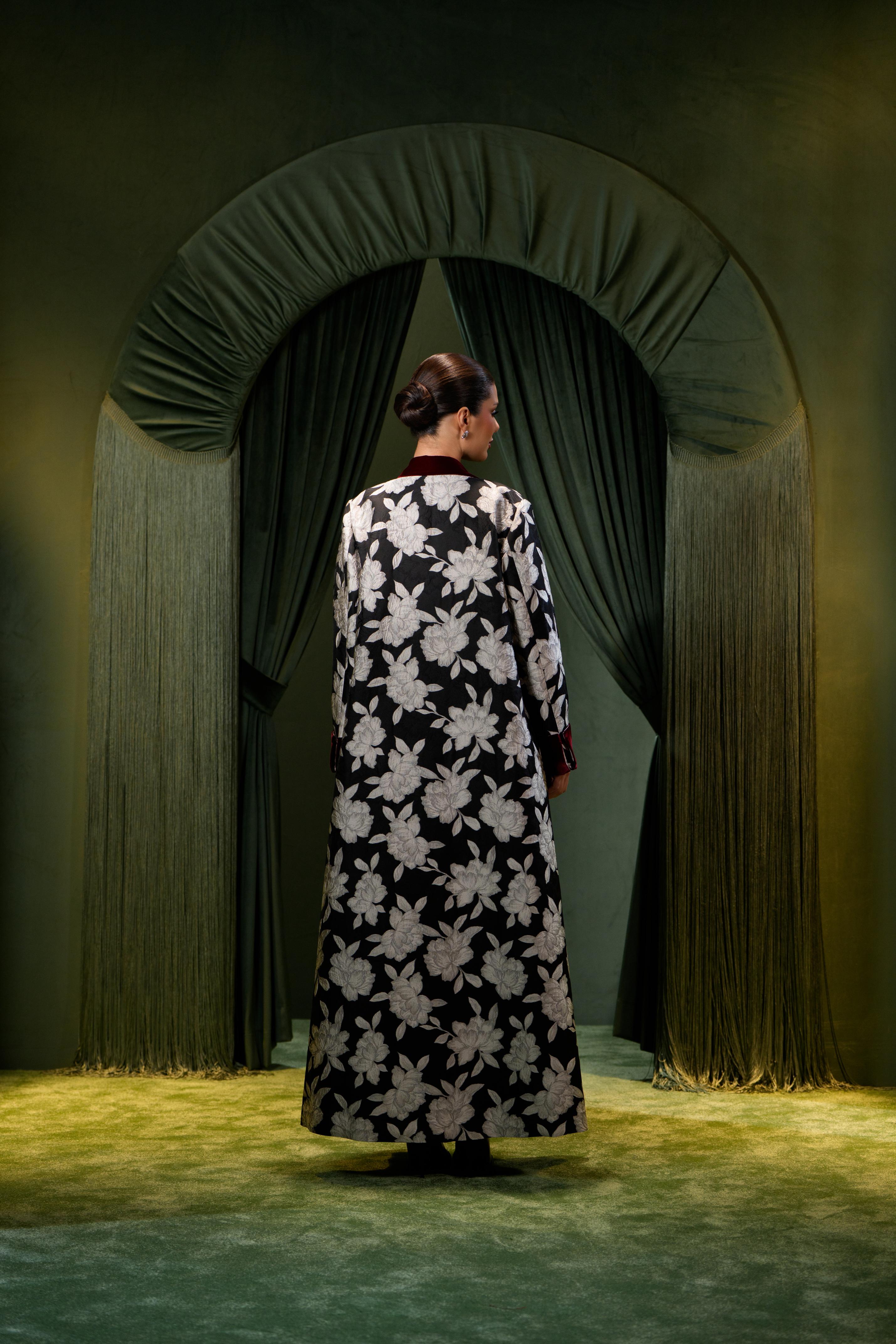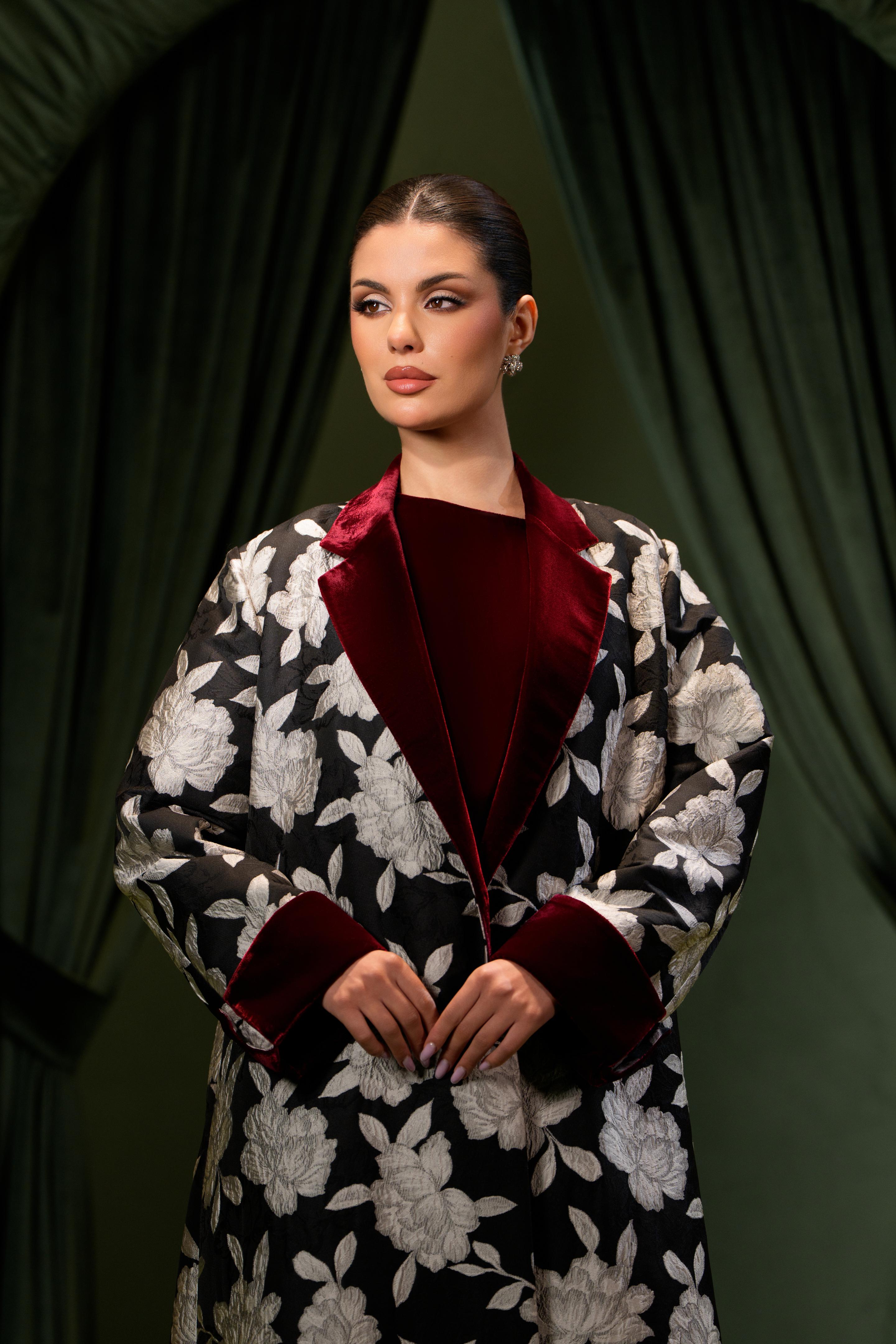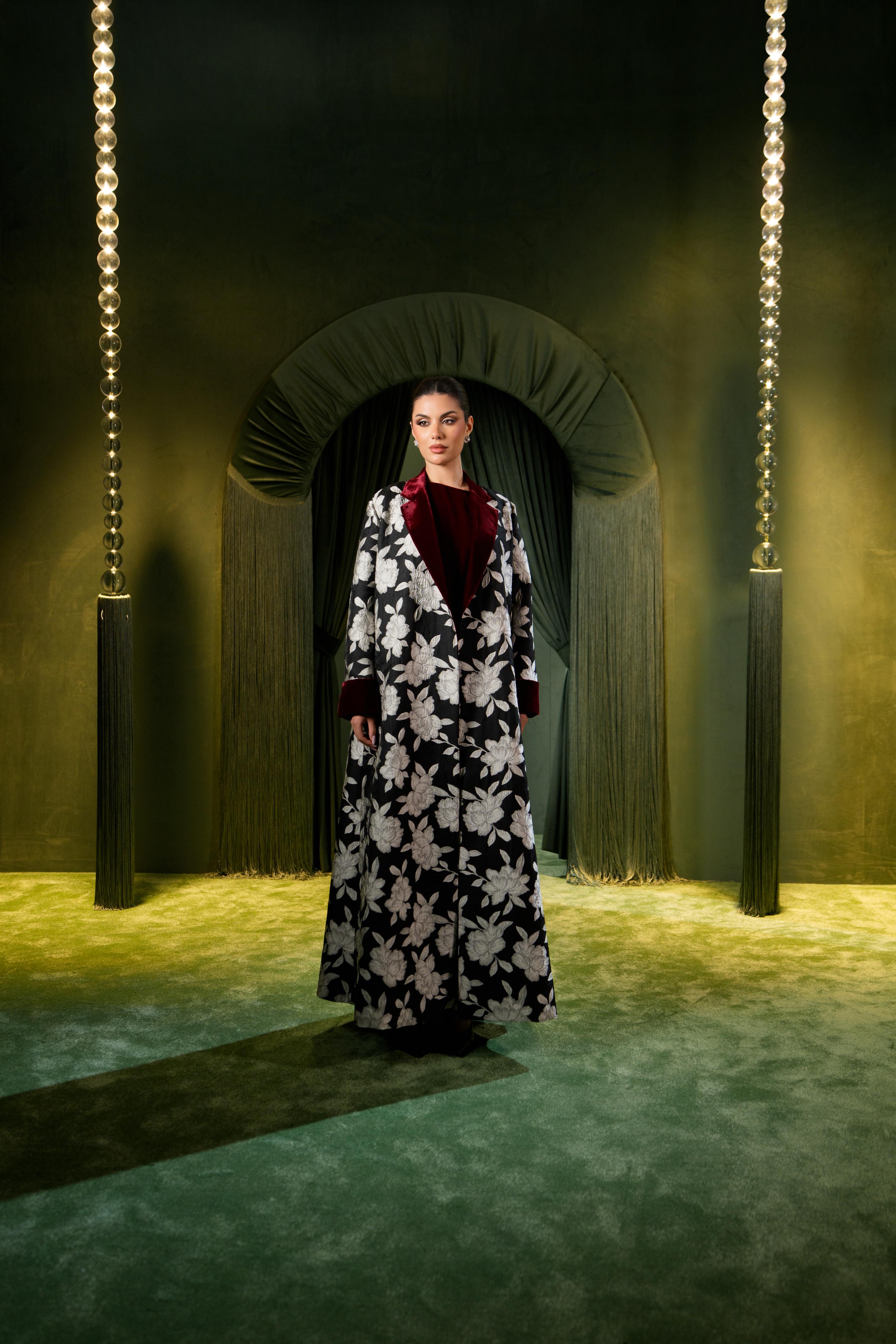 The Noor Floral Velvet-Trim Abaya is a sophisticated statement piece designed for timeless elegance. Crafted with a refined floral-patterned fabric, this abaya is elevated by rich velvet detailing along the lapel-style front and cuffs, creating a striking contrast that exudes understated luxury. Complementing the abaya is a beautifully designed inner...